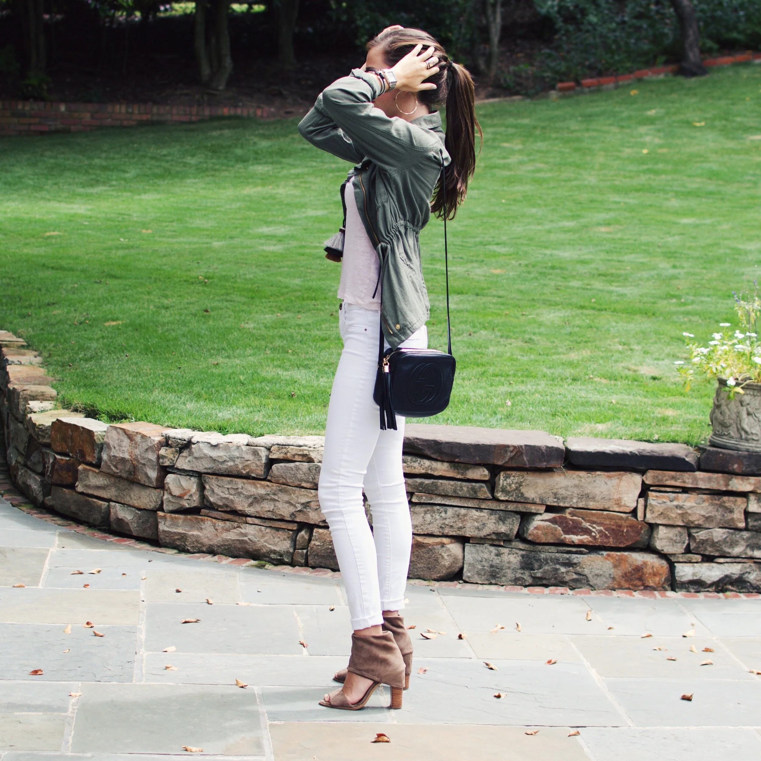 The best way to begin transitioning into fall fashion is by slowly adding cooler, darker colors into each outfit. For this look, I added my lightweight linen field jacket (one of my favorite finds from old navy) to contrast the bright white and blush pink top. To balance the darkness of the jacket, I wore my brown suede heels. I am so in love with all things suede for fall! To finish things off, I added one of my favorite necklaces by Twine + Twig and my favorite black bag! Thanks for reading! xo
